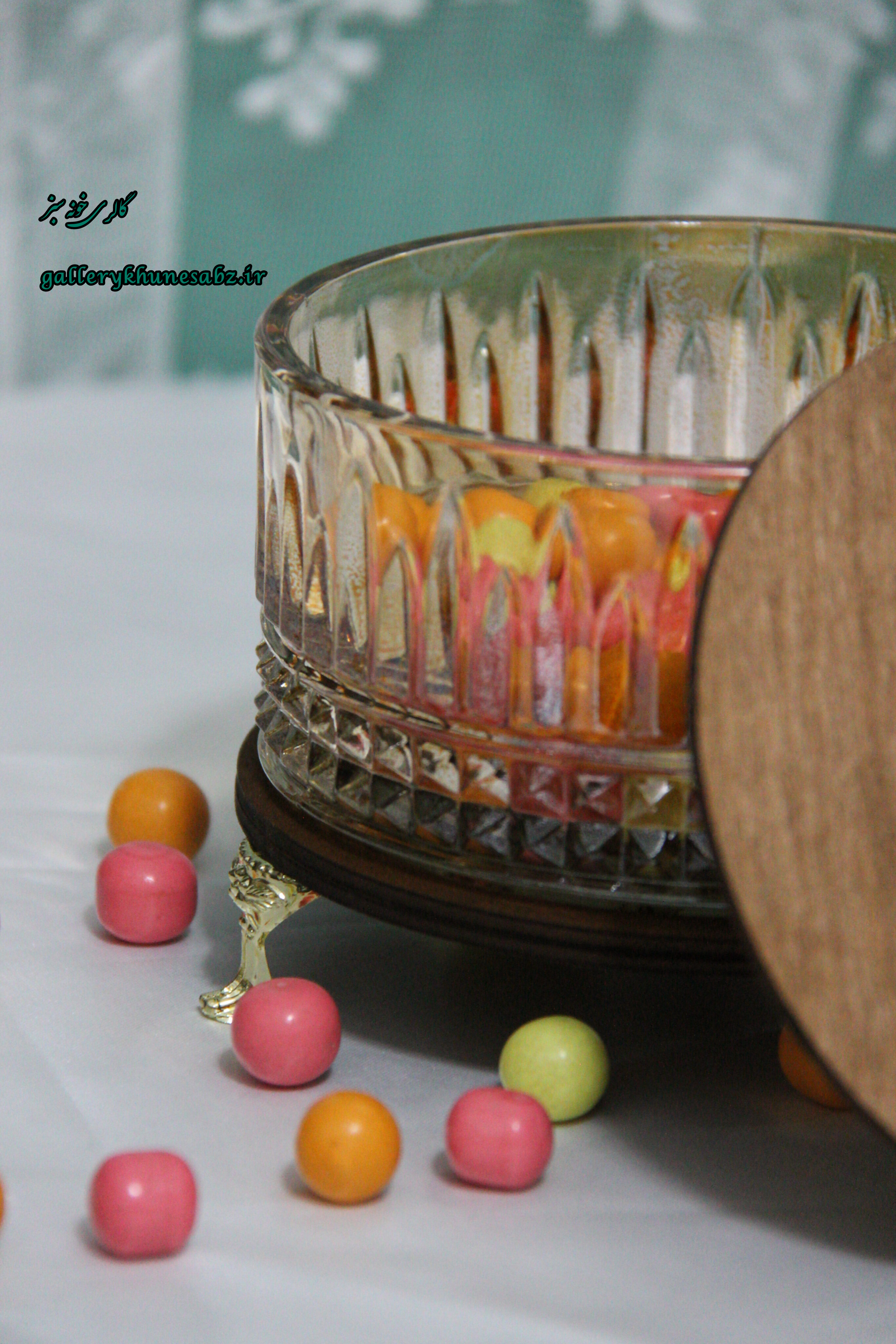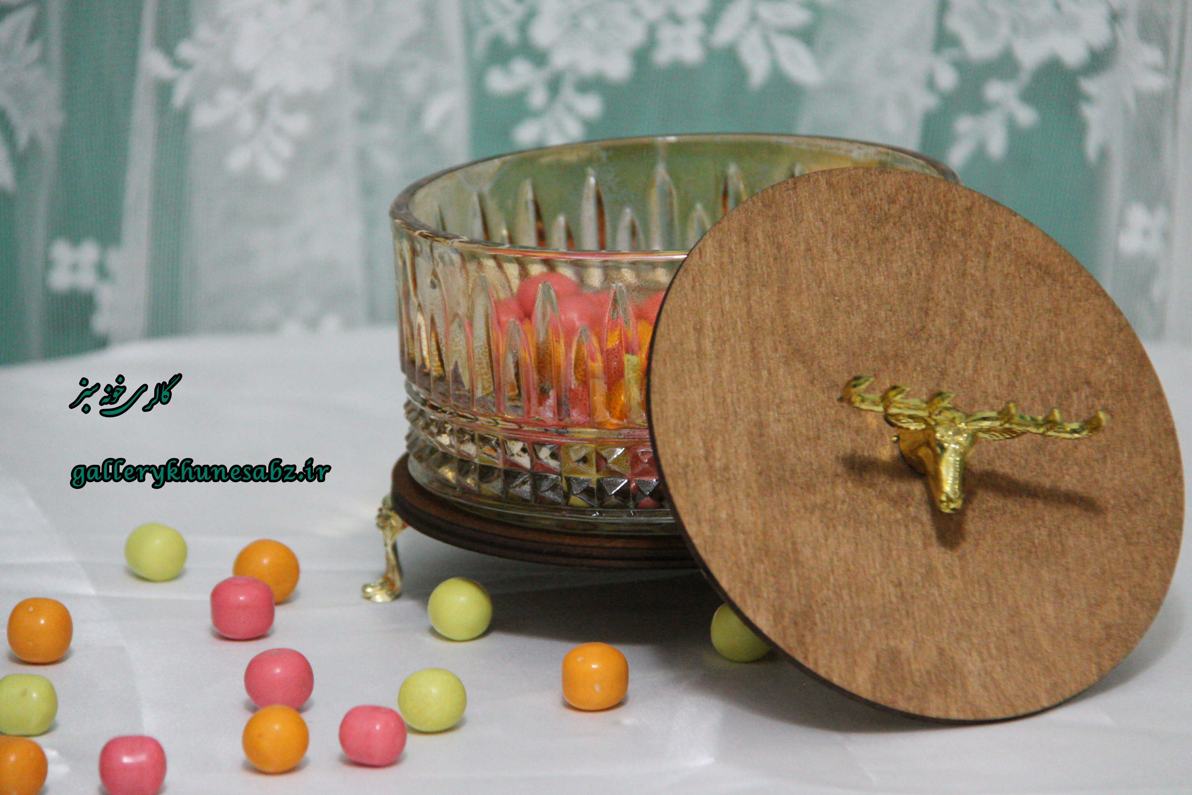 شکلات خوری شیشه شامپاینی درب چوبی استند چوبی پایه طلایی پر طرفدار و محبوب برای روی میز نهارخوری و میز عسلی